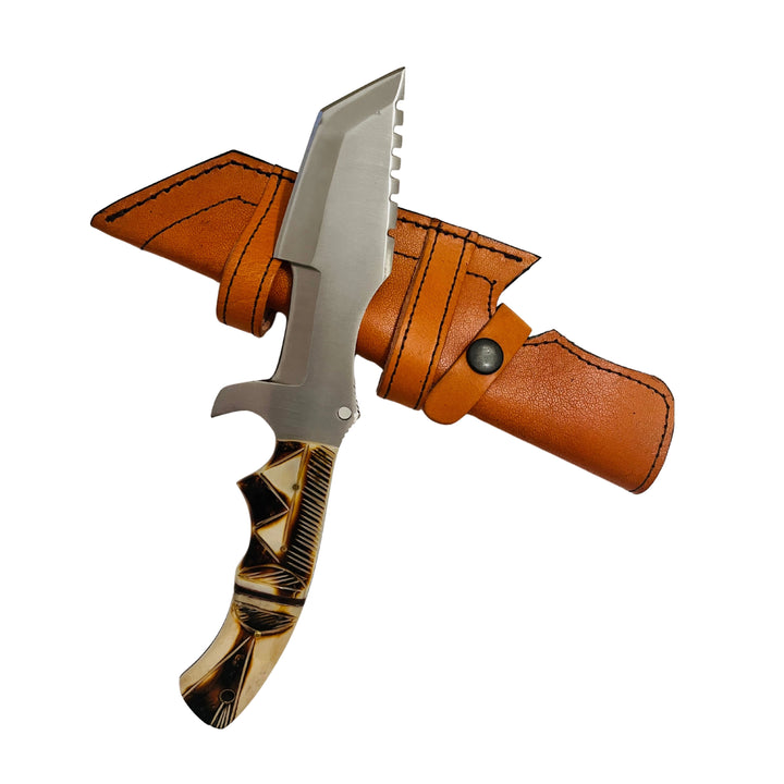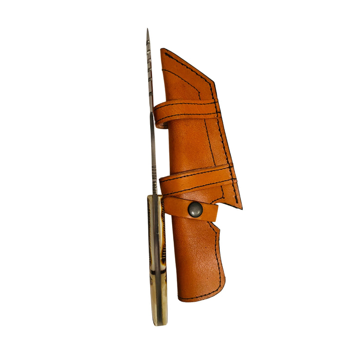 Crafted for durability and performance, this Stainless steel fixed-blade Knife is the ideal combination of strength, precision, and craftsmanship. Featuring a 6.5″ full tang blade, it delivers razor-sharp cutting power with excellent edge retention, while the ergonomic bone handle ensures a comfortable, secure grip even in harsh outdoor conditions. Designed for hunters, campers, survivalists, and collectors, this knife excels in field dressing, bushcraft, and everyday outdoor tasks. The hand-stitched leather sheath adds safety and convenience, making it easy to carry securely on any adventure. Whether you’re preparing game in the field, setting up camp, or adding to your collection, this knife is more than a tool; it’s a dependable outdoor companion and a standout piece for enthusiasts who value style and functionality.
