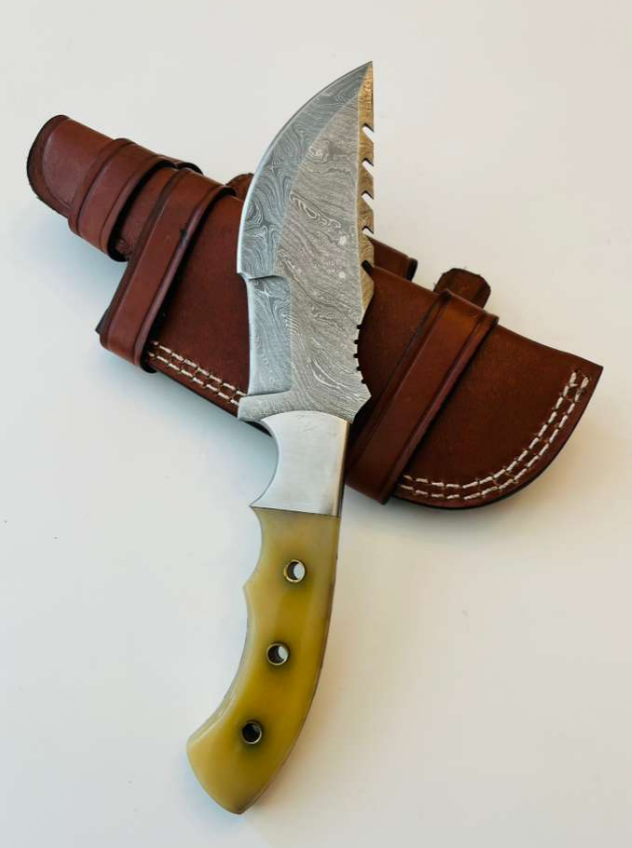 DAMASCEN Tracker hunting knife Bone Wood Handle with Premium Cowhide Leather Sheath
