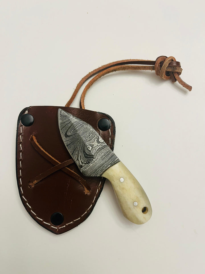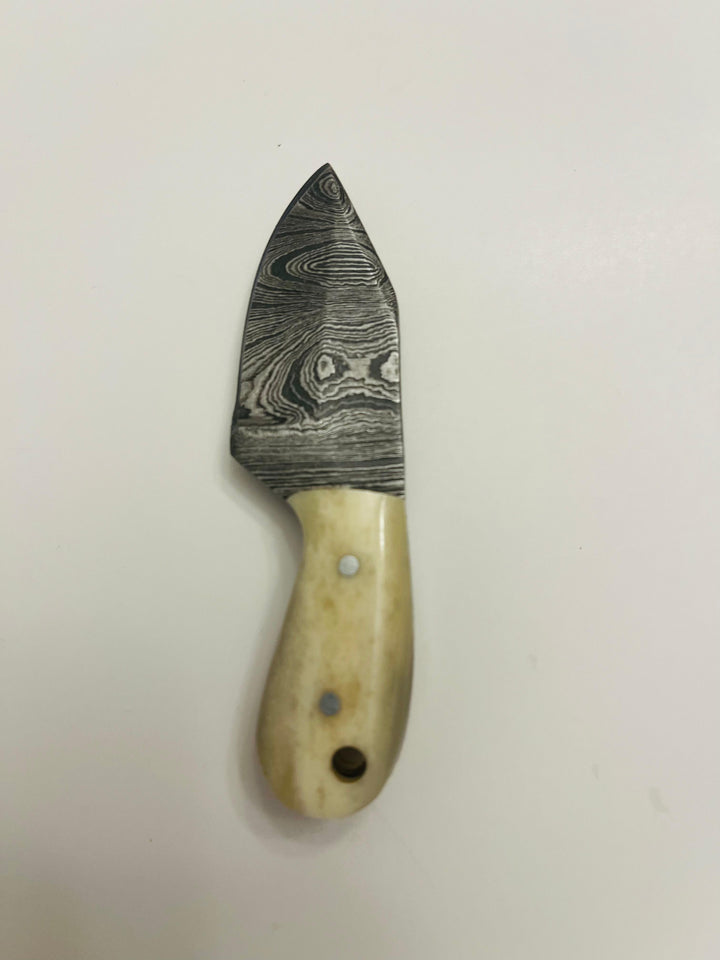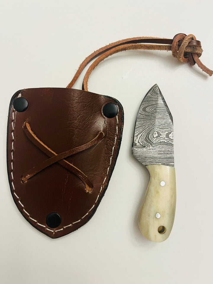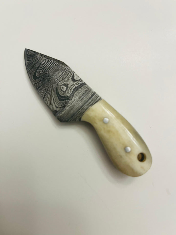 MB-101. Miniature Damascen bone handle skinner knife. Blade size 2” handle size 1.5” total length 3.5” with genuine leather sheath